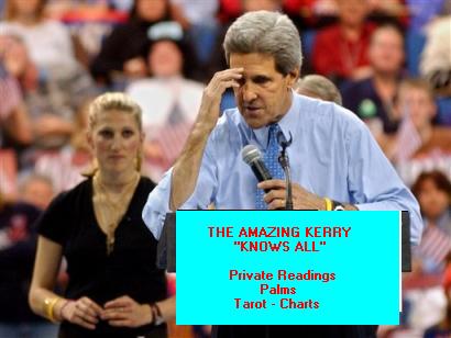 | AP: Huskbellie Iowa In a marathon 15-town campaign visit to the state of Iowa, Senator Kerry shocked a crowd of local Huskbellie residents. The Senator visited the city fair grounds where the Cornhusk Celebration was in progress. Kerry took to the main stage and declared himself a “Paranormal Psychic”. He proceeded to pick people from the crowd and tell their fortunes. His daughter looked on with concern when the Senator told her that she was the reincarnated soul of Billy Spankler, a local WWI veteran hero. Spankler passed away in 1995 at the age of 98. His wife, Betty is still alive and a resident of a local nursing home. When asked about the remarks the Senator made she said “He’s a damn fool, his daughter was born in 1981. How could she be Billy?” |