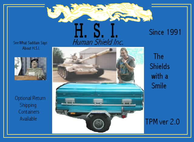 | Hi, I‘m Saddam Hussein and even through I am presently incarcerated by the invading American swine, I want to tell you about H.S.I., Human Shield Incorporated. During the first Gulf War, as the American pigs were massing to invade Kuwait, I though I could do it all, preparing the army, stealing and hiding money, killing people and getting human shields to place in front of my weapons factories. I didn’t know how over extended I was. I had Uday round up a few hundred human shields and place them around the country. What a sorry lot they were! They were slovenly, sullen and tended to run. With a full plate of mayhem, murder and looting, I could not give my human shields the attention they deserve. During the years that the infidel Clinton bombed me, I still thought I could do it all. Sure I had shields but they were and unimpressive lot. When the pig news cameras came to film the shields, they tended to have that “Deer in a Headlight” look and maybe 1 of 10 could speak a complete sentence. Then we had to contend with the inevitable “Know It All” shield. They would ask silly questions like “How do the Americans, that are launching the missiles and dropping the bombs, know we are here protecting the schoolhouses? Nothing but trouble! Well, when Bush’s son was preparing the next invasion I decided to get help. I found H.S.I and within 48 hours of placing an order, I had two planeloads of human shields in Baghdad. I was also impressed by how they looked. The women wore dresses and the men penny loafers and nice slacks. I placed them in front of all the big weapons dumps, missile factories and important government buildings like the Ministry of Torture. We would tell them they were protecting hospitals and orphanages and boy did they perk right up. The other impressive thing was how they dealt with the pig western news media. When a camera was pointing their way, they would get this far away pensive look with big puppy dog eyes. It was great. Disposal was also easy because we would just say here's a CNN crew and when they looked away, we could sneak up behind them. I am 100% satisfied with H.S.I. and will recommend them to all my friends. When the Jihad frees me and I once again take my place as the "Lion of Babylon", I will be sure to get my human shields from H.S.I. When there is a war to wage, money to steal, and a country to loot, don’t be a fool and try to do it all. Call H.S.I. now. Allah Be Praised. |